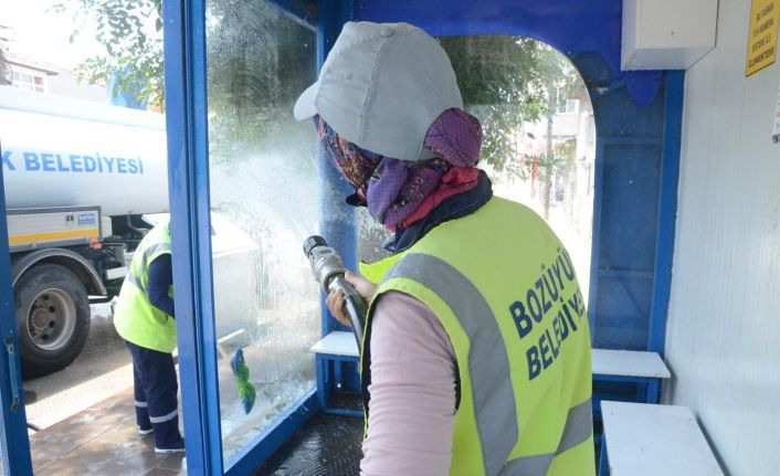 Bozüyük Belediyesi’nde çalışan kadın işçiler otobüs duraklarını temizliyor.