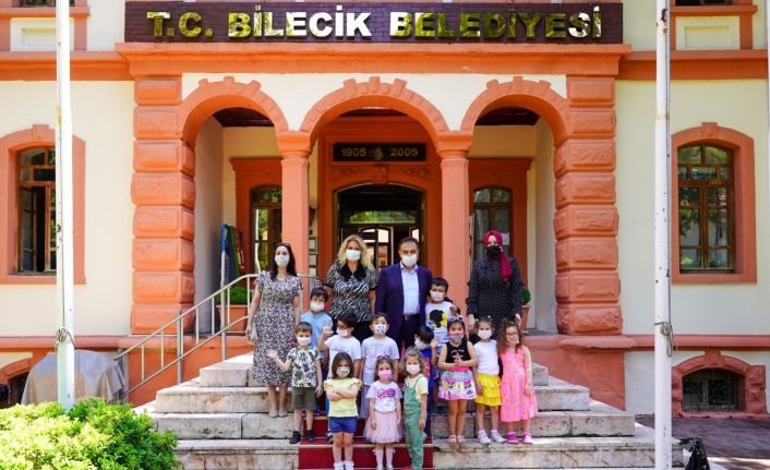 Bilecik Mor Mavi Anaokulu öğrencileri Bilecik Belediye Başkanı Semih Şahin’in daveti üzerine belediyeye gitti. Burada belediye işleyişi, belediye başkanın görevleri hakkında bilgi alan öğrenciler, Belediye Başkanı Semih Şahin’e çizdikleri resimleri hediye ettiler. Belediye Başkanı Semih Şahin’e merak ettikleri soruları yönelten minikler, bol bol fotoğraf çektirerek belediye binasından mutlu şekilde ayrıldılar.