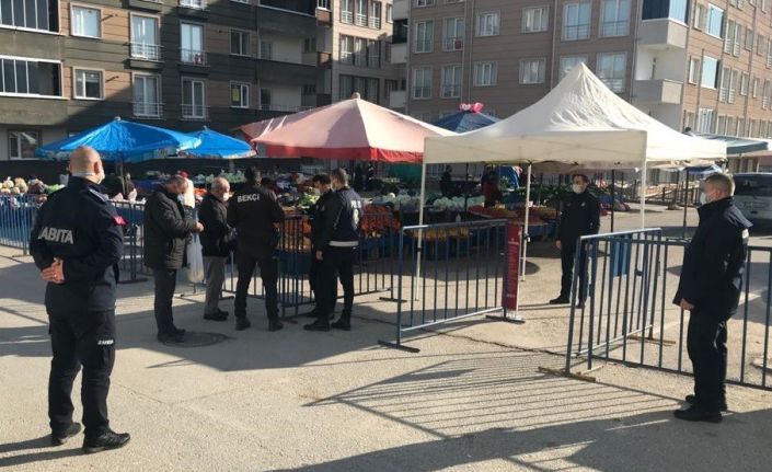 Bilecik’te zabıta ve polislerden oluşan denetim ekibi, pazar alanında salgınla mücadele denetimi yaptı.