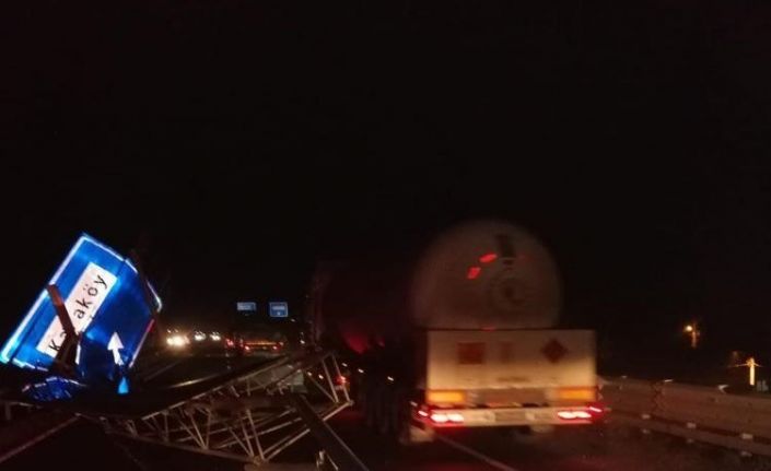 Seyir halindeyken bir anda damperi açılan kamyon yön levhasına devirdi