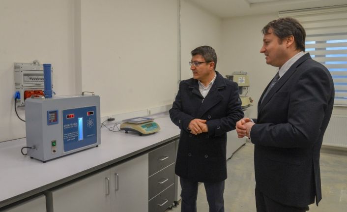 Rektör Taş’a ziyaretinde Proje Koordinatörü Doç. Dr. Cenk Karakurt, Öğr. Gör. Merve Paksoy ve Arş. Gör. İlhan Aslan eşlik ederek laboratuar çalışmaları ve cihazlar hakkında bilgi verdi.