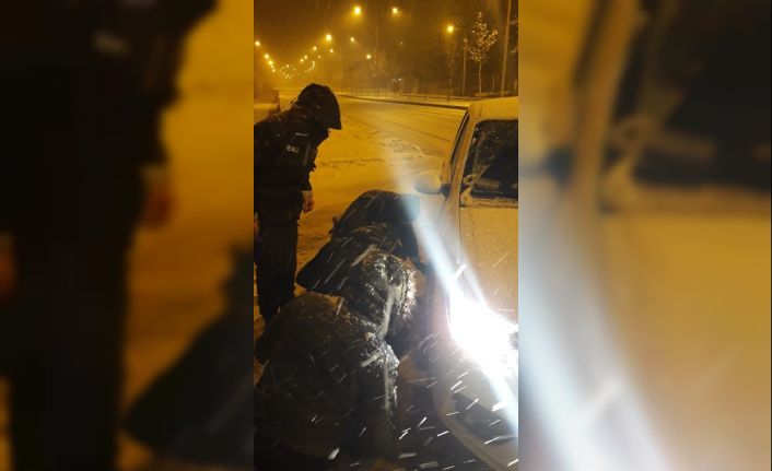 Bilecik’in Osmaneli İlçesinde akşamüzeri aniden başlayan kar yağışı nedeni ile yolda zincir takmaya çalışan bir vatandaşa polis ve bekçiler yardımcı oldu.