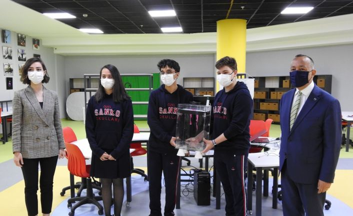 Öğrencileri laboratuvar ve ameliyathanelerde kullanılan laminer dikey akımının asansörlerde de kullanılabileceğini ispat ettiklerini söyleyen SANKO Okulları Genel Müdürü Fırat Mümtaz Asyalı, “Son 12-13 aydır tüm dünyada bir korona virüs salgını var. Öğrencilerimiz korona virüsün asansörde yayılımını azaltmak için bir proje geliştirdiler. Normalde asansörlerde bir havalandırma sistemi var ama türbülans şeklinde içerideki havayı döndürüyor. Bu durumda içeride bir virüs varsa tekrar yayılmasını sağlıyor. Öğrencilerimiz laminer dikey akım sistemini kullanarak asansördeki hava direk bir şekilde aşağı doğru gidiyor ve aşağıdan dışarıya doğru tahliye ediliyor. Öğrencilerimiz laminer akım sisteminin asansörlerde de çalışabileceğini ispat ettiler. Proje ile ilgili patent başvurumuzu da yaptık” diye konuştu.
