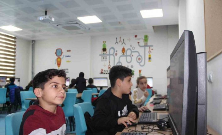 Şırnak’ın Cizre Gençlik Merkezinde açılan robotik kodlama sınıfı öğrencileri, bilgisayarda kendi tasarladıkları oyunları oynuyor.