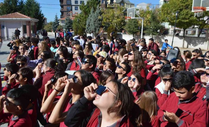 Kütahya’nın Tavşanlı ilçesinde bugün gerçekleşen parçalı güneş tutulmasını yüzlerce öğrenci izledi. Tavşanlı ilçesi Moymul Ortaokulu’nda 6. sınıf öğrencileri Fen Bilimleri öğretmenlerinin rehberliğinde "Güneş Tutulması " konusunu bir okul etkinliği çerçevesinde yaşayarak öğrendiler.