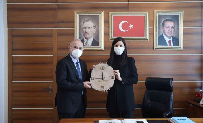 Gösterilen misafirperverlik için şükranlarını bildiren Rektör Ünal, ziyaret sonunda Çiğdem Karaaslan’a, adının yazılı olduğu OMÜ işlemeli duvar saatini hediye etti.