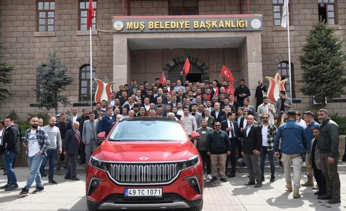 Muş Belediye Meydanı’na getirilen otomobile yoğun ilgi gösteren vatandaşlar, yakından inceledikleri aracın yanında fotoğraf çektirdi.