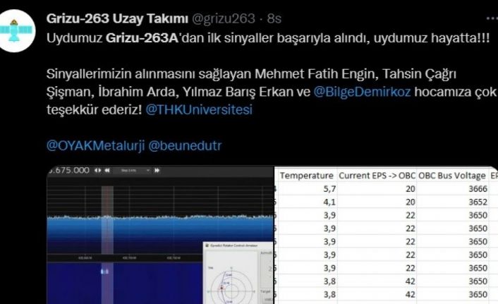 "Uydumuz ’Grizu-263A’dan ilk sinyaller başarıyla alındı, uydumuz hayatta. Sinyallerimizin alınmasını sağlayan Mehmet Fatih Engin, Tahsin Çağrı Şişman, İbrahim Arda, Yılmaz Barış Erkan ve Bilge Demirköz hocamıza çok teşekkür ederiz."