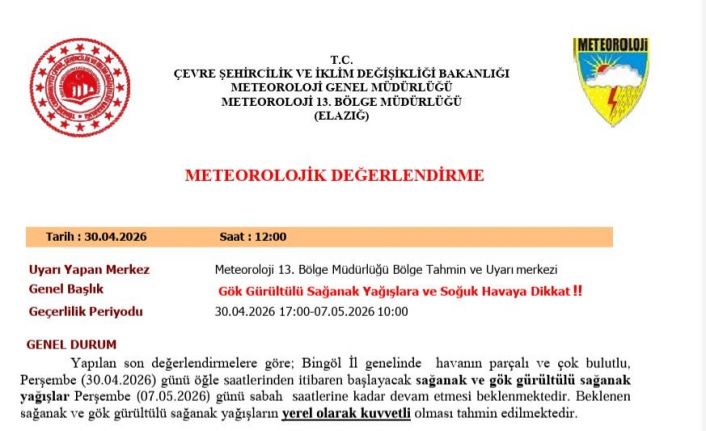 Meteoroloji 13. Bölge Müdürlüğü’nden yapılan uyarıda, "Yapılan son değerlendirmelere göre; Bingöl İl genelinde havanın parçalı ve çok bulutlu, Perşembe (30.04.2026) günü öğle saatlerinden itibaren başlayacak sağanak ve gök gürültülü sağanak yağışlar Perşembe (07.05.2026) günü sabah saatlerine kadar devam etmesi beklenmektedir. Beklenen sağanak ve gök gürültülü sağanak yağışların yerel olarak kuvvetli olması tahmin edilmektedir. Mevsim normalleri civarında seyreden hava sıcaklıklarının 03.05.2026 itibari ile mevsim normallerinin 4 ila 6 derece altında seyredeceği, Rüzgarların güney ve güneydoğu yönlerden orta, yağış anında kuvvetli eseceği beklenmektedir. Vatandaşlarımızın ve ilgili kurumların, Meteoroloji Genel Müdürlüğü ve Meteoroloji 13. Bölge Müdürlüğü tarafından yapılacak meteorolojik uyarılar ile Radar uyarılarınını takibi, meydana gelebilecek olumsuzlukların önlenmesi ve gerekli tedbirlerin zamanında alınabilmesi amacıyla takip edilmesi gerekmektedir" denildi.