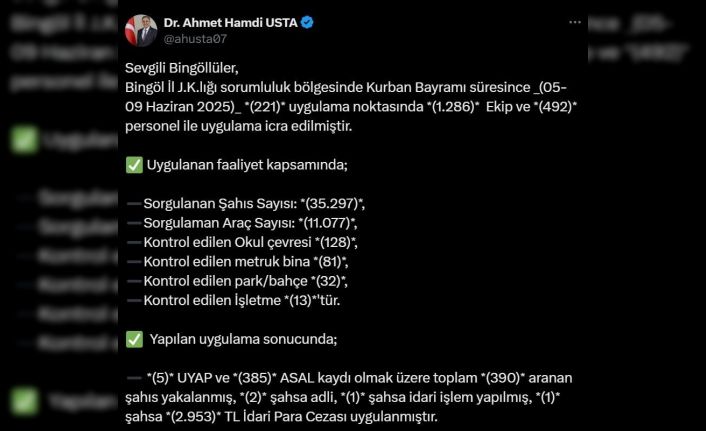 Bingöl’de Kurban Bayramı süresince İl Jandarma Komutanlığı ekipleri huzur ve güveni sağlamak için gece gündüz çalıştı. Bu çerçevede 221 uygulama noktasında bin 286 ekip ve 492 personel görev aldı. Uygulanan faaliyet kapsamında, 35 bin 297 şahıs ve 11 bin 77 araç sorgulanırken 128 okul çevresi, 81 metruk bina, 32 park ve bahçe ile 13 işletme kontrol edildi.