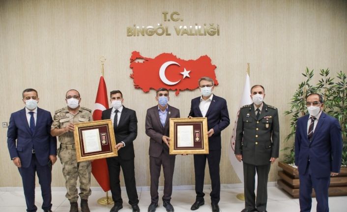 Cumhurbaşkanı Recep Tayyip Erdoğan’ın himayesinde Bingöl Valiliği’ne gönderilen Devlet Övünç Madalyaları ve Beratlarının Tevcihi töreni düzenlendi. Programa Vali Kadir Ekinci, 49. Komando Tugay Komutan Vekili Albay Ercan Aygündüz, İl Emniyet Müdürü Ali Canbolat ve Aile, Çalışma ve Sosyal Hizmetler İl Müdürü Mehmet Emin Çakan katıldı. Törende Vali Ekinci, 2017 yılında Hakkari Şemdinli’de gazi olan İdris Tuğunmuş ve 2016 yılında Şırnak’ta gazi olan Uzman Çavuş Ferhat Erce’ye Cumhurbaşkanı Erdoğan adına Devlet Övünç Madalyası ve Beratı’nı tevdi etti.