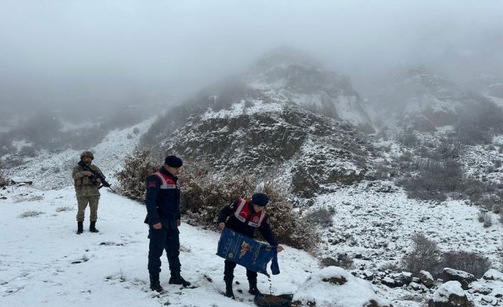 Bingöl’de jandarma ekiplerince soğuk havalarda yem bulmakta zorlanan hayvanlar için doğaya yiyecek bırakıldı.