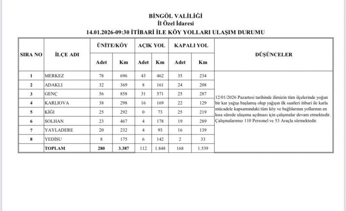 Yapılan çalışmalar neticesinde 112 köy yolu ulaşıma açılırken, halen kapalı durumda bulunan 168 köy yolunda kar küreme ve yol açma çalışmalarının devam ettiği bildirildi. Yetkililer, kapalı yolların da en kısa sürede ulaşıma açılmasının hedeflendiğini belirtti.
