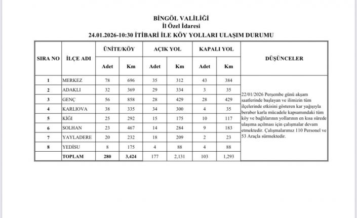 Kar yağışının özellikle yüksek kesimlerde etkisini artırması nedeniyle 103 köy yolunda ise kar küreme ve yol açma çalışmaları devam ediyor. Ekiplerin, hava şartlarının elverdiği ölçüde kapalı yolları yeniden ulaşıma açmak için gece gündüz demeden çalıştığı bildirildi.