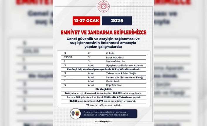 Polis ve jandarma ekipleri tarafından son 2 haftada aranan şahıslara yönelik düzenlenen operasyonlarda, haklarında çeşitli suçlardan kesinleşmiş hapis cezası sebebiyle arama kaydı bulunan 13, ifadeye yönelik arama kaydı bulunan 47 olmak üzere toplam 60 kişi yakalandı. Genel güvenlik ve asayişin sağlanması ve suç işlenmesinin önlenmesi amacıyla yapılan çalışmalarda 5 gram kokain, 225.33 gram esrar maddesi, 1 gram metamfetamin, 3 adet uyuşturucu kullanım aparatı ele geçirildi. Yapılan operasyonlarda 16 kişi gözaltına alındı.