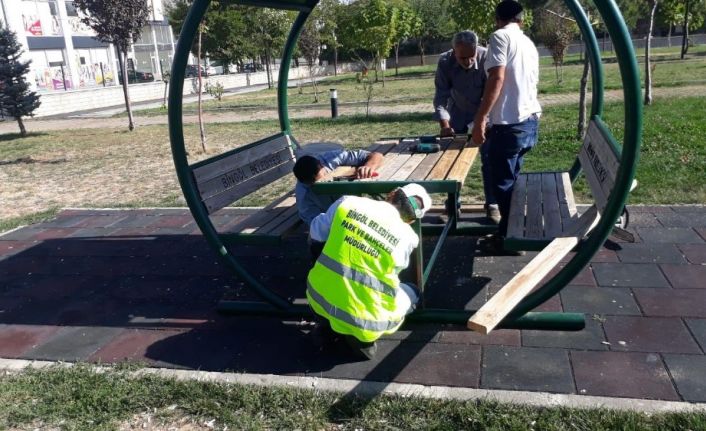 Bingöl’de bazı parklarda oturma ve oyun alanlarına kimliği belirsiz kişiler zarar verirken, belediye ekipleri onarım çalışmasına başladı.