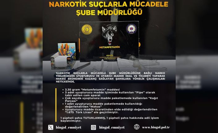 Bingöl Emniyet Müdürlüğü Narkotik Suçlarla Mücadele Şube Müdürlüğüne bağlı narko timlerince uyuşturucu ve uyarıcı madde imal ve ticareti yapan şahıslara yönelik operasyon gerçekleştirildi. Operasyonda 3.30 gram metamfetamin, 3 adet uyuşturucu madde içiminde kullanılan pipe olarak tabir edilen cam aparat, çok sayıda uyuşturucu madde paketlemede kullanılan kağıt parçası, 1 adet uyuşturucu madde paketlemede kullanıldığı değerlendirilen makas, uyuşturucu madde ticaretinden elde edildiği değerlendirilen bin 675 lira ele geçirildi. Operasyonda yakalanan 1 şahıs tutuklanarak cezaevine gönderilirken, 1 şahıs hakkında da adli işlem başlatıldı.