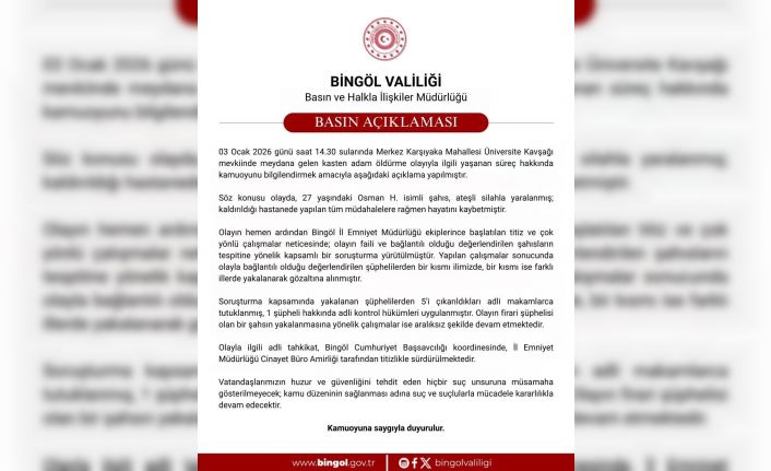 Bingöl Valiliği’nden yapılan açıklamada, "03 Ocak 2026 günü saat 14.30 sularında merkez Karşıyaka Mahallesi Üniversite Kavşağı mevkiinde meydana gelen kasten adam öldürme olayıyla ilgili yaşanan süreç hakkında kamuoyunu bilgilendirmek amacıyla aşağıdaki açıklama yapılmıştır. Söz konusu olayda, 27 yaşındaki Osman H. isimli şahıs, ateşli silahla yaralanmış; kaldırıldığı hastanede yapılan tüm müdahalelere rağmen hayatını kaybetmiştir. Olayın hemen ardından Bingöl İl Emniyet Müdürlüğü ekiplerince başlatılan titiz ve çok yönlü çalışmalar neticesinde; olayın faili ve bağlantılı olduğu değerlendirilen şahısların tespitine yönelik kapsamlı bir soruşturma yürütülmüştür. Yapılan çalışmalar sonucunda olayla bağlantılı olduğu değerlendirilen şüphelilerden bir kısmı ilimizde, bir kısmı ise farklı illerde yakalanarak gözaltına alınmıştır. Soruşturma kapsamında yakalanan şüphelilerden 5’i çıkarıldıkları adli makamlarca tutuklanmış, 1 şüpheli hakkında adli kontrol hükümleri uygulanmıştır. Olayın firari şüphelisi olan bir şahsın yakalanmasına yönelik çalışmalar ise aralıksız şekilde devam etmektedir. Olayla ilgili adli tahkikat, Bingöl Cumhuriyet Başsavcılığı koordinesinde, İl Emniyet Müdürlüğü Cinayet Büro Amirliği tarafından titizlikle sürdürülmektedir" denildi.