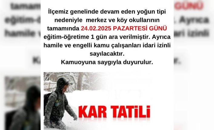 Karlıova Kaymakamlığı’ndan yapılan açıklamada, "İlçemiz genelinde devam eden yoğun tipi nedeniyle merkez ve köy okullarının tamamında 24.02.2025 pazartesi günü eğitim-öğretime 1 gün ara verilmiştir. Ayrıca hamile ve engelli kamu çalışanları idari izinli sayılacaktır" denildi.
