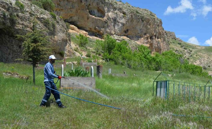 Yapılan çalışmalar çerçevesinde ilçe merkezinde bulunan 11 mezarlıkta 400 litre ilaç kullanıldığı bildirildi.