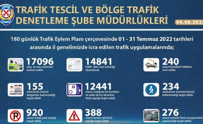 Bitlis Emniyet Müdürlüğü Trafik Tescil ve Bölge Trafik Denetleme Şube Müdürlüğü, 1-31 Temmuz tarihleri arasında düzenlenen trafik uygulama verilerini paylaştı.