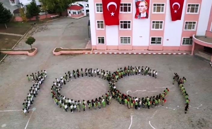 Merkezde bulunan Şehit Mahir Ayabak İlkokulu öğrencileri tarafından koreografi çalışması ile Cumhuriyet’in 100. yılı logosu oluşturuldu.