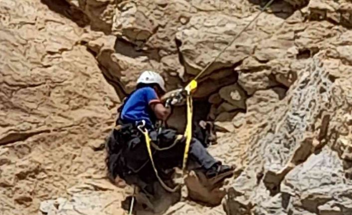 Bitlis’in Tatvan ilçesinde kayalıklarda 4 gündür boyunca mahsur kalan keçi, Afet ve Acil Durum Başkanlığı (AFAD) ekiplerinin uzun uğraşları sonucu kurtarıldı.