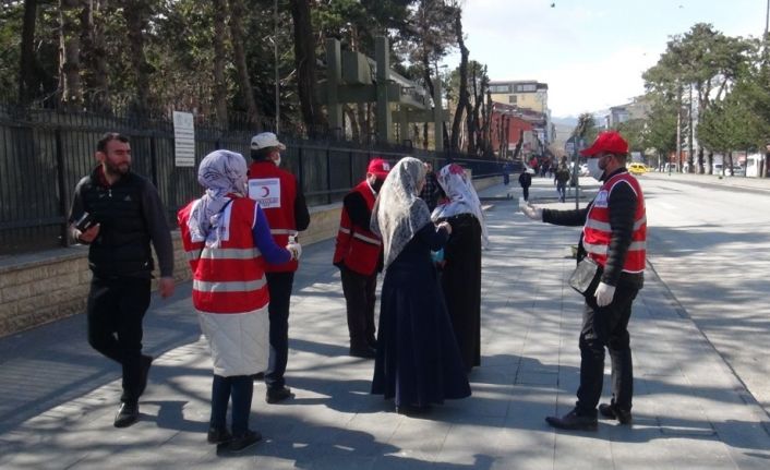 Türk Kızılayı gönüllüleri tarafından Bitlis’in Tatvan ilçesinde maske ve dezenfektan jeli dağıtıldı.