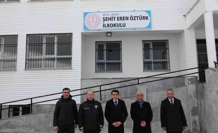 İlçenin Kulaksız Mahallesine yapılan 20 derslikli okula Şehit Eren Öztürk’ün adı verilirken, ilçe merkezinde yapılan 4 derslikli bir diğer okula ise Hayme Hatun Anaokulu adı verildi. Ahlat Kaymakamı Fikret Dağ yeni yapılan okulu ziyaret ederek, Milli Eğitim Müdürü Mutluk Özden’den ve okul müdürü Muammer Akyol’dan bilgi aldı. Bir süre okulu gezerek incelemelerde bulunan Kaymakam Dağ, gazetecilere yaptığı açıklamada yeni okulun gayet güzel olduğunu belirterek, “İlçemize yeni yapılan 20 derslikli ilk ve ortaokulumuza şehidimiz Eren Öztürk kardeşimizin isminin verilmesi bizleri ziyadesiyle mutlu etmiştir. Bu vesileyle Eren kardeşimiz başta olmak üzere, tüm şehitlerimizi ve gazilerimizi rahmetle yâd ediyorum. Yeni okulumuz hayırlı olsun” dedi.