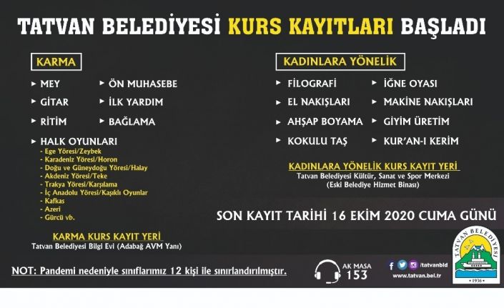 Tatvan belediyesinden yapılan açıklamada, “Tatvan Belediyesi Kültür ve Sosyal İşler Müdürlüğü’ne bağlı Tatvan Belediyesi Bilgi Evi ve Tatvan Belediyesi Kültür, Sanat ve Spor Merkezi’nde olmak üzere 2 merkezde toplamda 15 branşta kurs verilecek. Kursların kayıtları Tatvan Belediyesi Bilgi Evi ve Tatvan Belediyesi Kültür, Sanat ve Spor Merkezi’nde gerçekleştirilecek. Kadınlar için açılacak filografi, iğne oyası, el nakışları, ahşap boyama, makine nakışları, giyim üretim, kokulu taş ve Kur’an-ı Kerim kurslarından oluşurken karma kurslarımızda ise mey, gitar, bağlama, ritim, ilk yardım, ön muhasebe ve halk oyunları kurslarından oluşmaktadır. Halk oyunlarında ise Ege Yöresi/Zeybek, Karadeniz Yöresi/Horon, Doğu ve Güneydoğu Yöresi/Halay, Akdeniz Yöresi/Teke, Trakya Yöresi/Karşılama, İç Anadolu Yöresi/Kaşıklı Oyunlar, Kafkas, Azeri, Gürcü vb. alt oyun kursları açılacaktır. Kurslara başvuru için son tarih 16 Ekim 2020 Cuma günü Halk Eğitim Merkezi ile beraber açılacak olan kurslar ücretsizdi” denildi.
