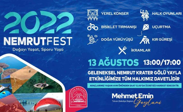 Düzenlenecek olan “Nemrut Yayla” şenlikleri ile ilgili bilgi veren Tatvan Belediye Başkanı Mehmet Emin Geylani, tüm halkı 13 Ağustos Cumartesi günü saat 13.00’da şenliklere ve aynı günün akşamında Tatvan sahili etkinlik alanında düzenlenecek Samida konserine davet etti. Başkan Emin Geylani, “Nemrut Dağı ve Krater Gölü’nün Avrupalı Seçkin Destinasyonlar Projesi (EDEN) çerçevesinde 2010 yılında ‘Mükemmeliyet Ödülü’ aldı. 2 bin 250 rakımlı Nemrut Krater Gölü, bölge halkının yanı sıra turistlerin de en çok ziyaret ettiği yerlerin başında geliyor. Böyle bir değeri daha fazla tanıtmak için her yıl belediyemiz tarafından ‘Geleneksel Nemrut Yayla Şenlikleri’ düzenleniyor. 13 Ağustos Cumartesi günü belediyemiz tarafından düzenlenecek şenlikte yerel konser, halk oyunları, bisiklet tırmanışı, uçurtma şenliği, doğa yürüyüşü, kır güreşi, çocuk şenlikleri gibi spor ve gösteri etkinleri olacak. Bu vesile ile ‘Geleneksel Nemrut Yayla Şenlikleri’ne tüm bölge halkını davet ediyoruz. Cumartesi günü 12.00’da Tatvan Alışveriş Merkezi (AVM) önünden ücretsiz servislerimiz kalkacak. İsteyen vatandaşlarımız araçları ile alana gelebilirler. Aracı olmayan vatandaşlarımızın da belirlenen saatte ulaşımını biz sağlayacağız” dedi.
