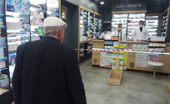 Bitlis’in Tatvan ilçesindeki bir eczane, korona virüsüne karşı alınan tedbirler kapsamında bir metre mesafe kuralına uymak için vatandaşların bulunduğu alan ile tezgah arasına şerit çekti.