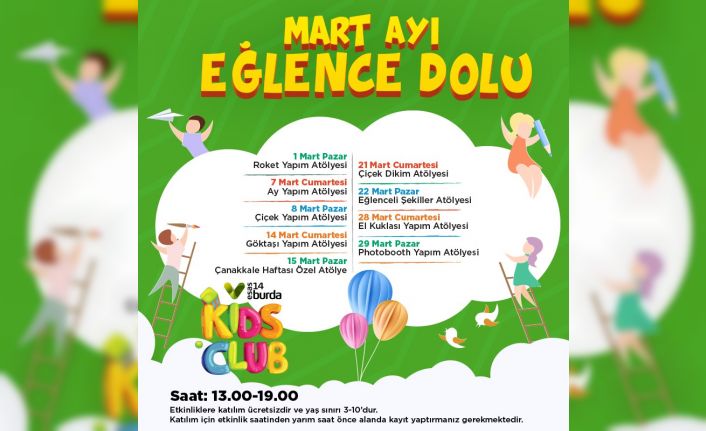 Küçük ziyaretçilerini birbirinden keyifli etkinliklerle karşılayan 14 Burda AVM, 8 Mart’ta çiçek yapım atölyesi, 14 Mart’ta göktaşı yapım atölyesi, 15 Mart’ta Çanakkale haftası özel atölye, 21 Mart’ta çiçek dikim atölyesi, 22 Mart’ta eğlenceli şekiller atölyesi, 28 Mart’ta el kuklası yapım atölyesi ve 29 Mart’ta photobooth yapım atölyesi ile çocuklara eğlenerek öğrenecekleri anlar yaşatacak.