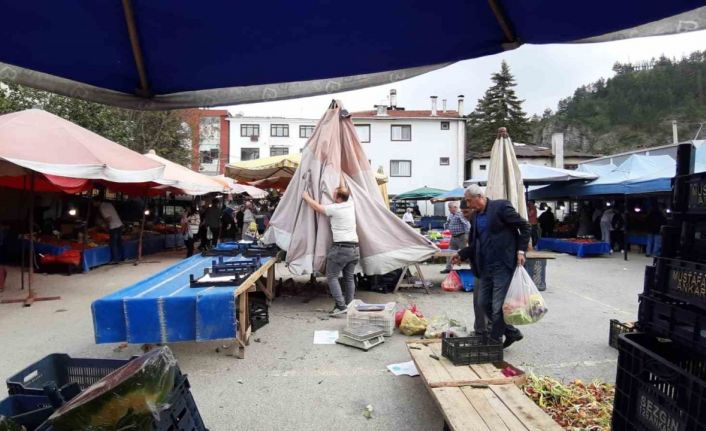 Bolu’nun Mudurnu ilçesinde kuvvetli rüzgar ve fırtına etkili olurken, kurulan semt pazarında vatandaşlar ve pazarcı esnafı zor anlar yaşadı.