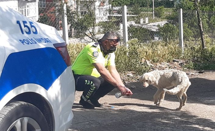 Bolu’da ekip aracıyla seyir halinde olan Şehir İçi Trafik Denetleme Ekipler Amiri Mehdi Çelebi, yol kenarında sıcaktan bunalan köpeğe kendi suyunu eliyle içirdi.