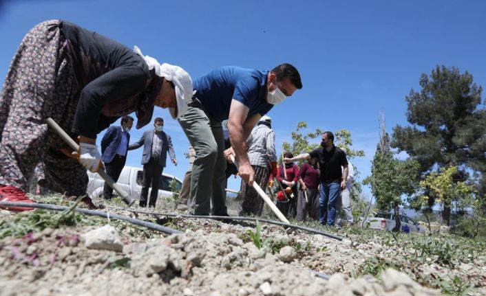 Burdur Valisi Ali Arslantaş, tarlada çapa yapan kadınlarla birlikte çapa yaptı.