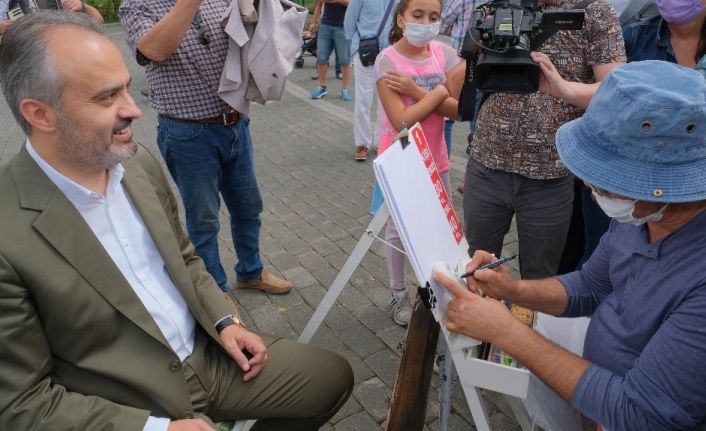 Bursa Kültürpark’ta yarım asırdır portatif sandalyesinde karikatür çizen Kemal Akkoç, parktaki 50’inci sanat yılı sergisinde Büyükşehir Belediye Başkanı Alinur Aktaş’ın portresini taşa çizdi.