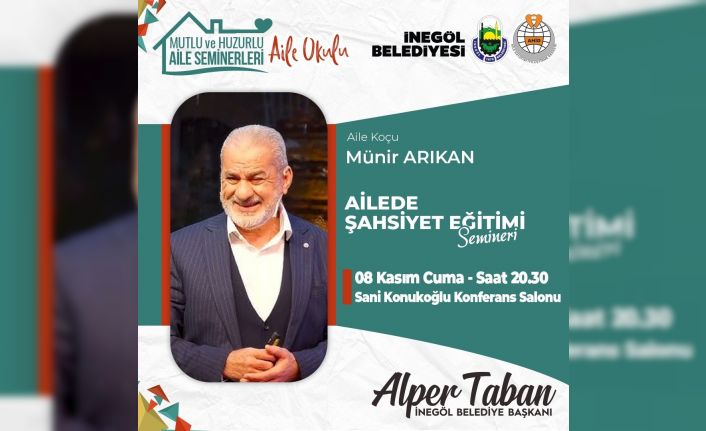 İnegöl Belediyesi’nin AHİD iş birliğinde gerçekleştirdiği “Aile Okulu” eğitimlerinin 4’üncü haftasında Cuma akşamı Aile Koçu Münir Arıkan “Ailede Şahsiyet Eğitimi” seminerinde İnegöllülerle buluşacak.