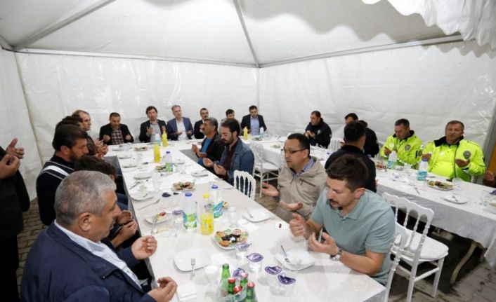 Kaymakam Eren Arslan ve Belediye Başkanı Alper Taban, ilçe protokolünün de katılımıyla şehir girişinde bulunan kontrol noktasında görevi başındaki polis memurlarıyla iftar sofrasında bir araya geldi.