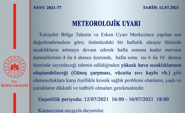 Valilikten yapılan açıklamada "Eskişehir Bölge Tahmin ve Erken Uyarı Merkezince yapılan son değerlendirmelere göre; önümüzdeki bir haftalık süreçte ilimizde sıcaklıkların artmaya devam ederek hafta sonuna kadar mevsim normallerinin 4 ila 6 derece üzerinde, hafta sonu ise 6 ila 10 derece üzerinde seyredeceği tahmin edildiğinden yüksek hava sıcaklıklarının oluşturabileceği (Güneş çarpması, vücutta sıvı kaybı vb.) gibi olumsuzluklara karşı özellikle kronik sağlık problemi olanların, yaşlı ve çocukların dikkatli ve tedbirli olmaları gerekmektedir. Geçerlilik periyodu: 12/07/2021 16:00 - 16/07/2021 18:00 Kamuoyuna saygıyla duyurulur" denildi.Bursa için sıcaklık uyarısı