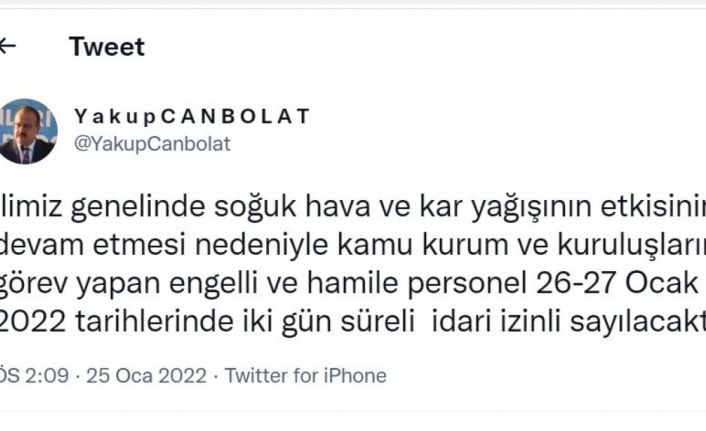 Bursa Valisi Canbolat’ın sosyal medya hesabından yaptığı açıklamada, "İlimiz genelinde soğuk hava ve kar yağışının devam etmesi sebebiyle kamu kurum ve kuruluşlarında görev yapan engelli ve hamile personel, 26-27 Ocak 2022 tarihlerinde iki gün idarî izinli sayılacaktır" ifadelerini kullandı.