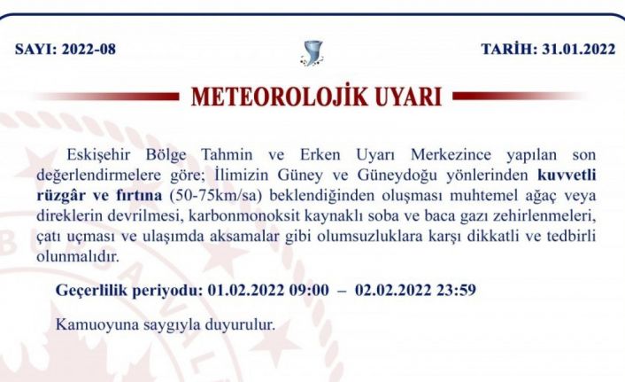 Bursa Valiliği’nden yapılan açıklamada şu ifadelere yer verildi: "Eskişehir Bölge Tahmin ve Erken Uyarı Merkezince yapılan son değerlendirmelere göre; İlimizin Güney ve Güneydoğu yönlerinden kuvvetli rüzgâr ve fırtına (50-75km/sa) beklendiğinden oluşması muhtemel ağaç veya direklerin devrilmesi, karbonmonoksit kaynaklı soba ve baca gazi zehirlenmeleri, çatı uçması ve ulaşımda aksamalar gibi olumsuzluklara karşı dikkatli ve tedbirli olunmalıdır. Geçerlilik periyodu: 01.02.2022 09:00 - 02.02.2022 23:59."