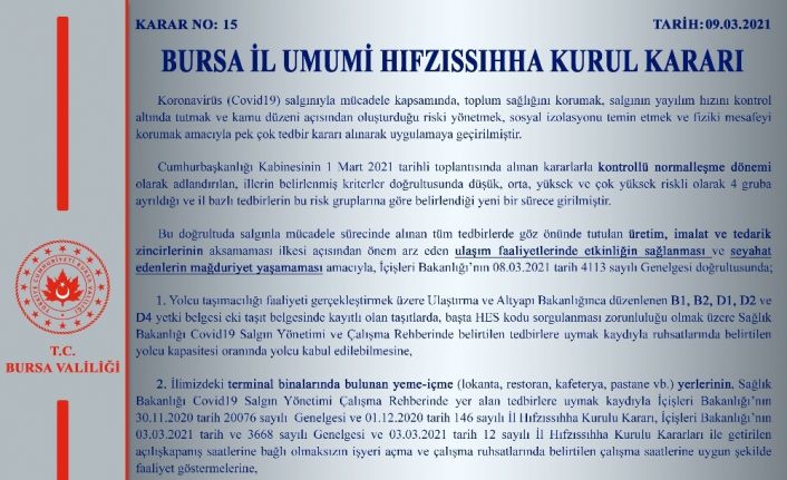 Bursa Valiliği İl Hıfzıssıhha Kurulu yeni tip korona virüs (Covid-19) tedbirleri kapsamında alınan yeni kararları duyurdu.