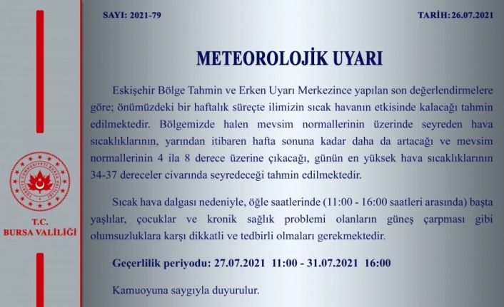Bursa Valiliği hafta sonuna kadar sürecek sıcak hava uyarısında bulundu.