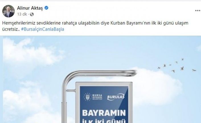 Bursa Büyükşehir Belediye Başkanı Alinur Aktaş sosyal medya hesabından "Hemşehrilerimiz sevdiklerine rahatça ulaşabilsin diye Kurban Bayramı’nın ilk iki günü ulaşım ücretsiz.. ’BursaİçinCanlaBaşla’ diyerek paylaştığı bildirimde BursaKart kullanmak suretiyle ücretsiz hizmet verecektir’ ve ’Uygulamanın kent içi ayakta yolcu taşıyan hatlarda geçerlidir’ ifadelerine yer verildi.