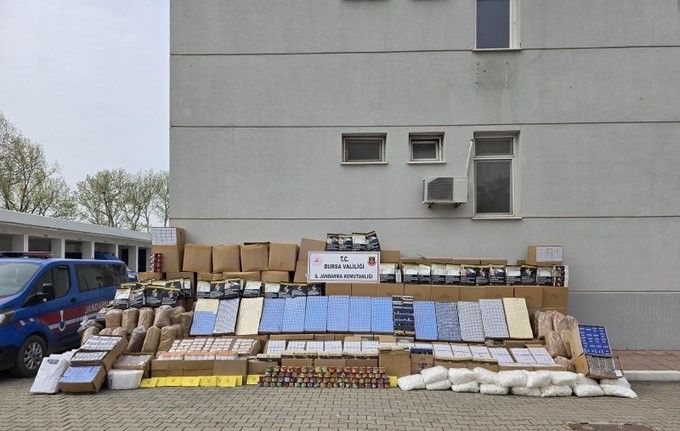 Bursa İl Jandarma Komutanlığı KOM Şube Müdürlüğü ekipleri tarafından kaçakçılıkla mücadele kapsamında yürütülen çalışmalar çerçevesinde, şüphelilere ait iş yeri, depo ve araçlarda arama yapıldı. Yapılan aramalarda 1 milyon 186 bin 600 adet bandrolsüz makaron, 920 kilogram açık sarmalık kıyılmış tütün, 200 bin 800 adet sigara filtresi, 92 bin 620 adet makarona basılmış sigara, 19 bin 800 adet şeffaf naylon sigara poşeti, 18 bin 750 adet boş sigara kutusu, 8 bin 780 paket bandrolsüz sigara, 2 bin 700 paket bandrolsüz sigara kağıdı ile 20 kilogram bandrolsüz nargile tütünü ele geçirildi.