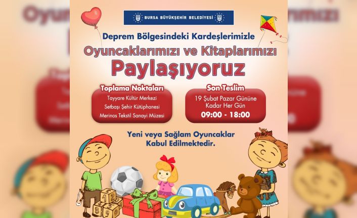 Depremin yaralarının bir an önce sarılması için arama kurtarmadan enkaz kaldırmaya, altyapı ve yol bakımlarından sosyal yardımlara kadar her alanda yoğun bir çalışma sergileyen Bursa Büyükşehir Belediyesi, deprem mağduru çocukları da unutmadı. Başlatılan kampanya ile toplanacak oyuncak ve kitaplar, bölgedeki deprem mağduru çocuklara ulaştırılacak.