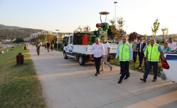 Hüdavendigar Parkı’ndaki çalışmaları yerinde inceleyen Bursa Büyükşehir Belediye Başkanı Alinur Aktaş, Sağlık İşleri Dairesi Başkanı Mehmet Fidan’dan son durum hakkında bilgi aldı. AK Parti Nilüfer İlçe Başkanı Eşref Kurem ile birlikte parktaki vatandaşlarla da sohbet eden Başkan Alinur Aktaş, personel tarafından yürütülen ilaçlama çalışmalarını yakından takip etti. 3 milyon 100 bin nüfuslu Bursa’da Sağlık İşleri Dairesi Başkanlığı Veteriner Hizmetleri Şube Müdürlüğü marifetiyle haşereyle mücadele konusunda önemli çalışmalar yürütüldüğünü söyleyen Başkan Alinur Aktaş, Sağlık Bakanlığı onaylı ve prosedüre uygun ekipman ve ilaçlarla mücadelenin yapıldığını hatırlattı. Sıcağın en fazla hissedildiği günleri yaşadıklarını belirten Başkan Aktaş, “Kurban Bayramı’nı da yeni bitirdik. Kurbanlık hayvanların şehir merkezlerine giriş yaptığı dönemden bayram sonrasındaki yaklaşık bir aylık süreç, karasinek popülasyonun artmasında önemli etkendir. Vatandaşlarımızın ve ekiplerimizin, sinek oluşturan unsurları bertaraf etme konusunda hassas davranmalarını istiyorum. Gelişi güzel bırakılan lastik parçası veya su dolu bir teneke, sinek üremesine bahanedir. Ekiplerimiz yoğun bir şekilde popülasyonu kontrol altında tutmaya çalışıyor. Yaklaşık 100 bin adet karasinek üreme noktası sezon boyunca ilaçlandı. Türkiye’de büyükşehir belediyeleri arasında bu konuda en fazla para harcayan, mücadele veren ve başarılı olan belediyelerden birisiyiz. Bu konuda çok iddialıyız” dedi.