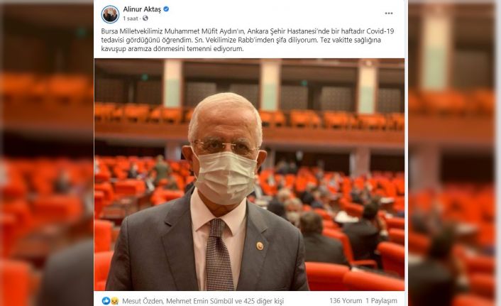 Bursa Büyükşehir Belediye Başkanı Alinur Aktaş, sosyal medya hesabından Aydın’a geçmiş olsun paylaşımında bulunarak, "Bursa Milletvekilimiz Muhammet Müfit Aydın’ın, Ankara Şehir Hastanesi’nde bir haftadır Covid-19 tedavisi gördüğünü öğrendim. Sn. Vekilimize Rabb’imden şifa diliyorum. Tez vakitte sağlığına kavuşup aramıza dönmesini temenni ediyorum" ifadelerini kullandı.Bursalı bir vekil daha koronaya yakalandı