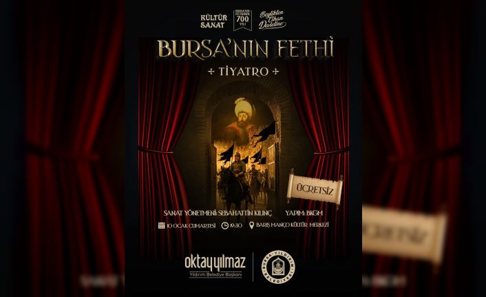 Yıldırım Belediyesi Kültür ve Sosyal İşler Müdürlüğü tarafından düzenlenen bir diğer etkinlik ise ‘Bursa’nın Fethi’ tiyatro oyunu olacak. Oyun, fetihte önemli bir rol oynayan Balaban Bey’in şahitlik ve anlatımlarıyla, Bursa’nın fethi sürecinde yaşananları sahneye taşıyacak. Sanat yönetmenliği Sebahattin Kılıç’ın yaptığı ve BKGM oyuncularının rol aldığı oyun, Barış Manço Kültür Merkezi’nde, 10 Ocak Cumartesi günü saat 19.30’da sahnelenecek.